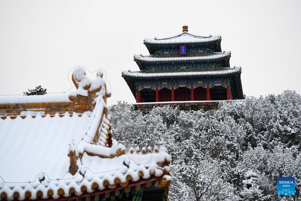 This photo taken on Feb. 21, 2024 shows the snow scenery at Jingshan Park in Beijing, capital of China. Beijing saw a snowfall on Tuesday. (Xinhua/Ju Huanzong)
