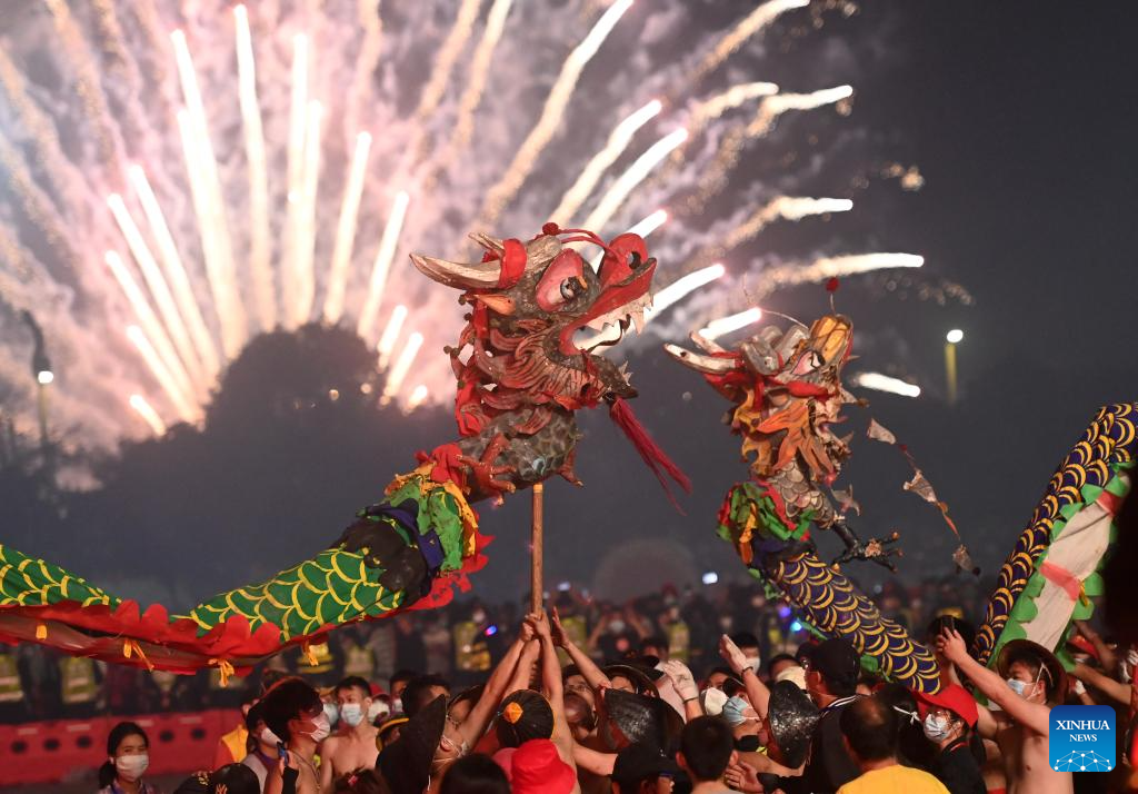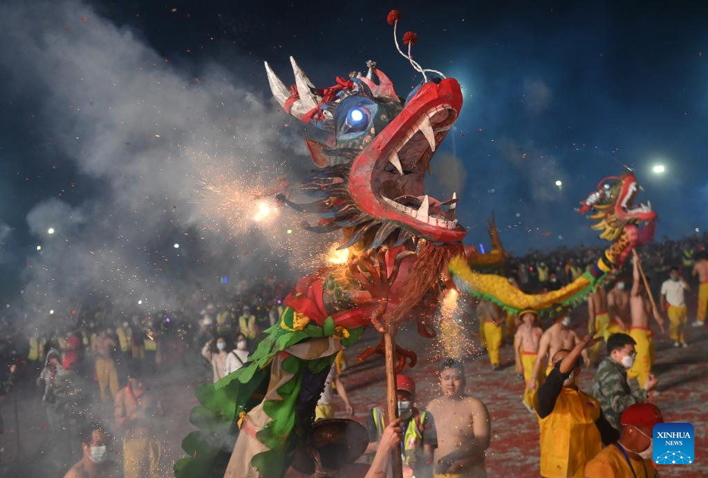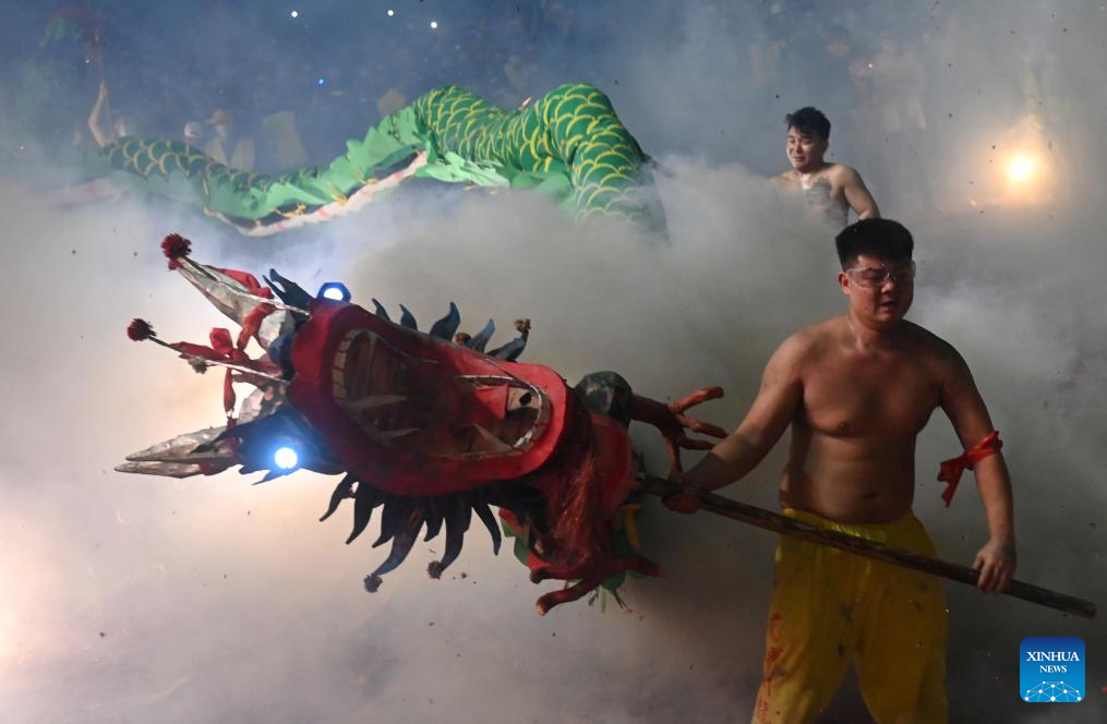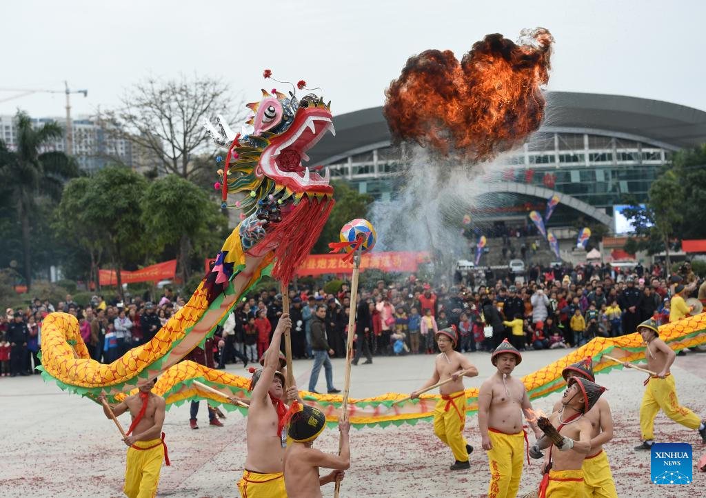 People perform firecracker dragon dance during Firecracker Dragon Festival in Binyang County, south China's Guangxi Zhuang Autonomous Region, Feb. 20, 2024. (Xinhua/Lu Boan)
