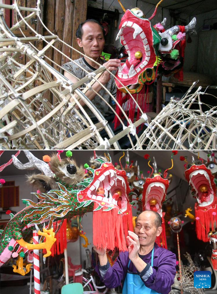 This combo photo shows craftsman Zou Yute making bamboo dragons for Firecracker Dragon Festival in Binyang County in south China's Guangxi Zhuang Autonomous Region, on April 5, 2006 (Top) and Jan. 16, 2024 (Below), respectively. (Xinhua/Lu Boan)