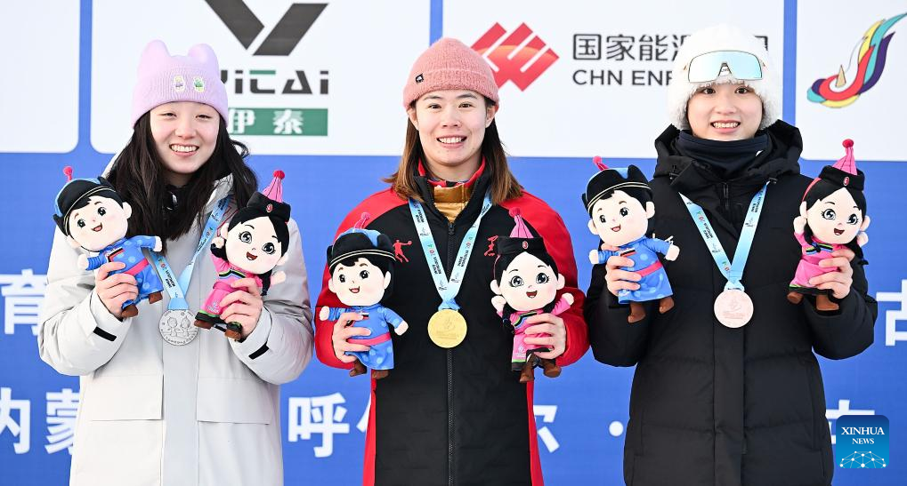 Gold medalist Kong Fanyu (C) of Heilongjiang, silver medalist Shao Qi (L) of Inner Mongolia and bronze medalist Liu Chixuan of Shaanxi attend the awarding ceremony for the freestyle skiing women's aerials competition at the 14th National Winter Games in Hulun Buir, north China's Inner Mongolia Autonomous Region, Feb. 21, 2024. (Xinhua/Yang Guanyu)