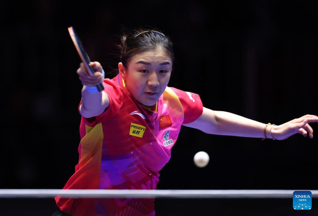 Chen Meng of China competes against Suthasini Sawettabut of Thailand during the women's team round of 16 match between China and Thailand at the ITTF World Team Table Tennis Championships Finals Busan 2024 in Busan, South Korea, Feb. 21, 2024. (Xinhua/Yang Shiyao)