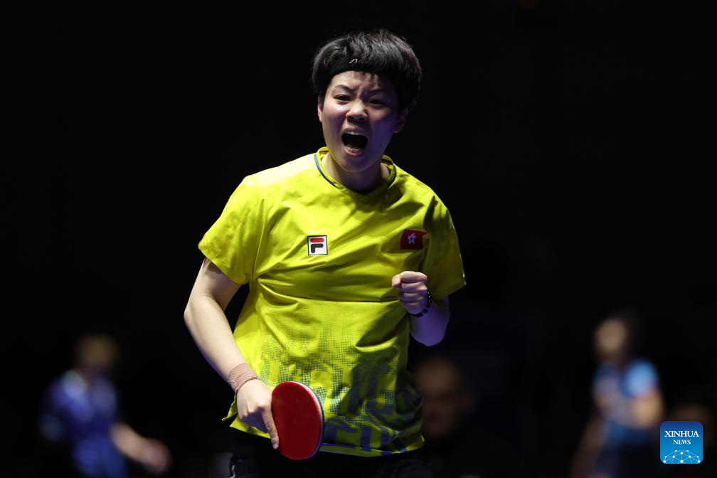 Doo Hoi Kem of China's Hong Kong celebrates while competing against Katarzyna Wegrzyn of Poland during the women's team round of 16 match at the ITTF World Team Table Tennis Championships Finals Busan 2024 in Busan, South Korea, Feb. 21, 2024. (Xinhua/Zhang Tao)