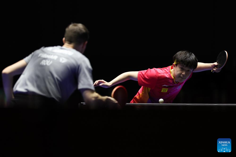 Fan Zhendong of China competes against Eduard Ionescu of Romania during the men's team round of 16 match at the ITTF World Team Table Tennis Championships Finals Busan 2024 in Busan, South Korea, Feb. 21, 2024. (Xinhua/Zhang Tao)