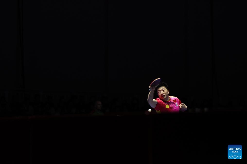 Ma Long of China competes against Darius Movileanu of Romania during the men's team round of 16 match at the ITTF World Team Table Tennis Championships Finals Busan 2024 in Busan, South Korea, Feb. 21, 2024. (Xinhua/Zhang Tao)