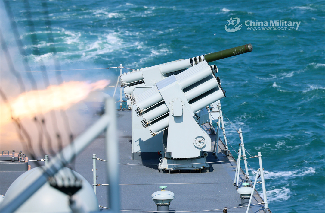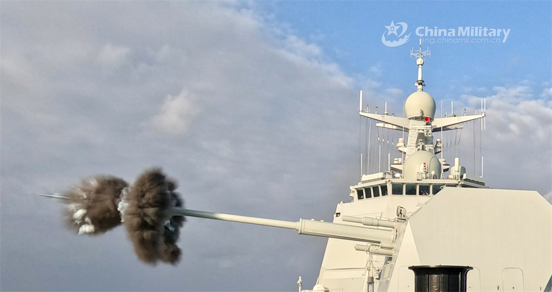 A naval vessel attached to a flotilla under the PLA Southern Theater Command fires its main gun at mock targets during a training exercise in late January, 2024. (eng.chinamil.com.cn/Photo by Zhang Huzhi)