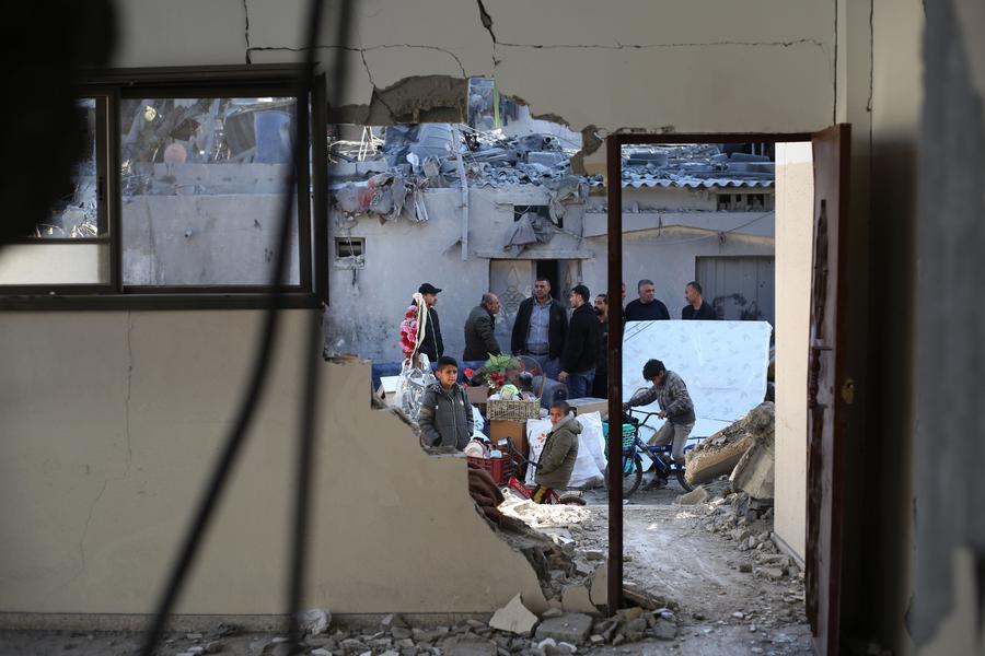 People check the rubble of a building destroyed in an Israeli air strike in the southern Gaza Strip city of Rafah, on Feb. 21, 2024. (Photo by Khaled Omar/Xinhua)