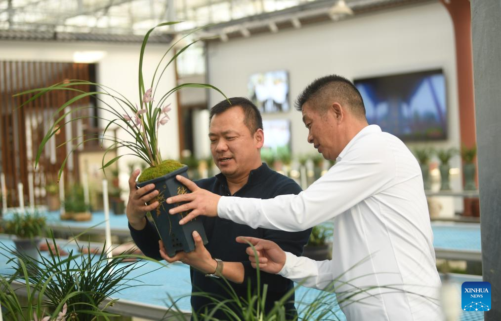 Liu Jianming (R) learns about orchid growth in Tangdi Village of Keqiao District in Shaoxing, east China's Zhejiang Province, Feb. 19, 2024.(Xinhua/Weng Xinyang)