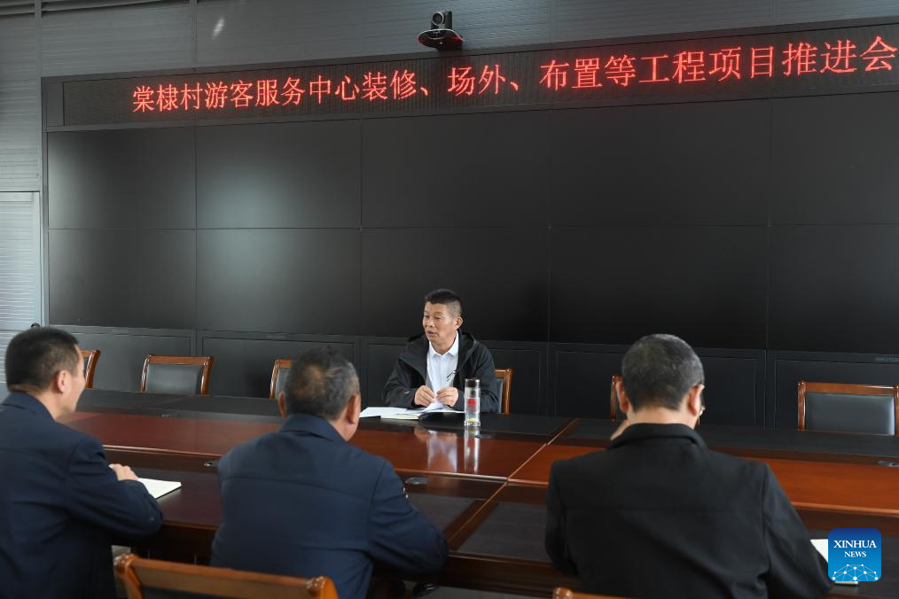 Liu Jianming (back) attends a meeting on the construction of tourist service center in Tangdi Village of Keqiao District in Shaoxing, east China's Zhejiang Province, Feb. 19, 2024.(Xinhua/Weng Xinyang)