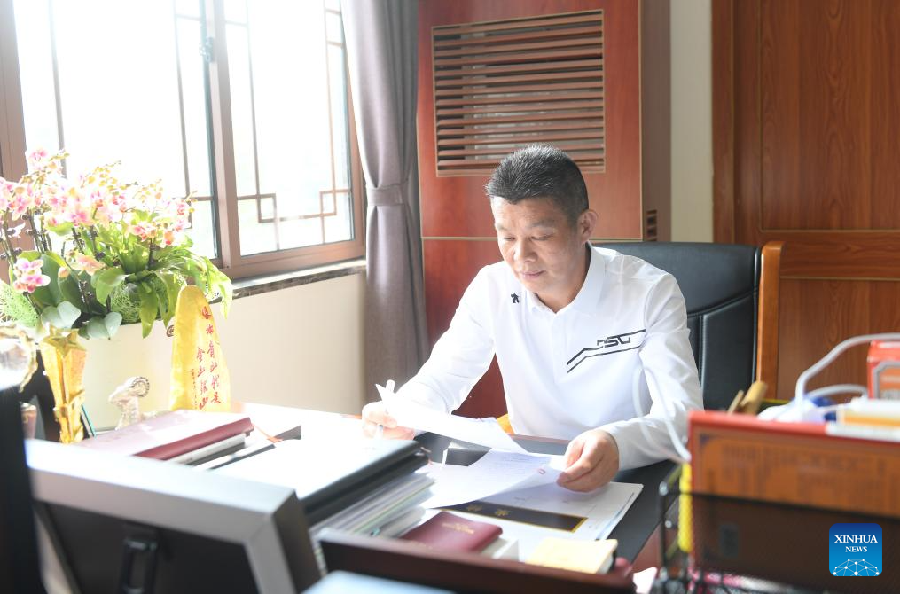 Liu Jianming works at a local legislators' liaison station in Tangdi Village of Keqiao District in Shaoxing, east China's Zhejiang Province, Feb. 19, 2024. (Xinhua/Weng Xinyang)