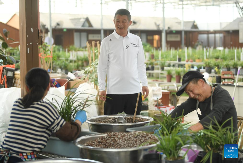 Liu Jianming is pictured at an orchid planting base in Tangdi Village of Keqiao District in Shaoxing, east China's Zhejiang Province, Feb. 19, 2024.(Xinhua/Weng Xinyang)