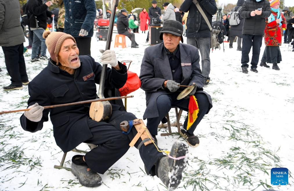 Folk artists perform during the Quyi fair in Majie Village of Baofeng County, central China's Henan Province, Feb. 22, 2024. (Xinhua/Hao Yuan)