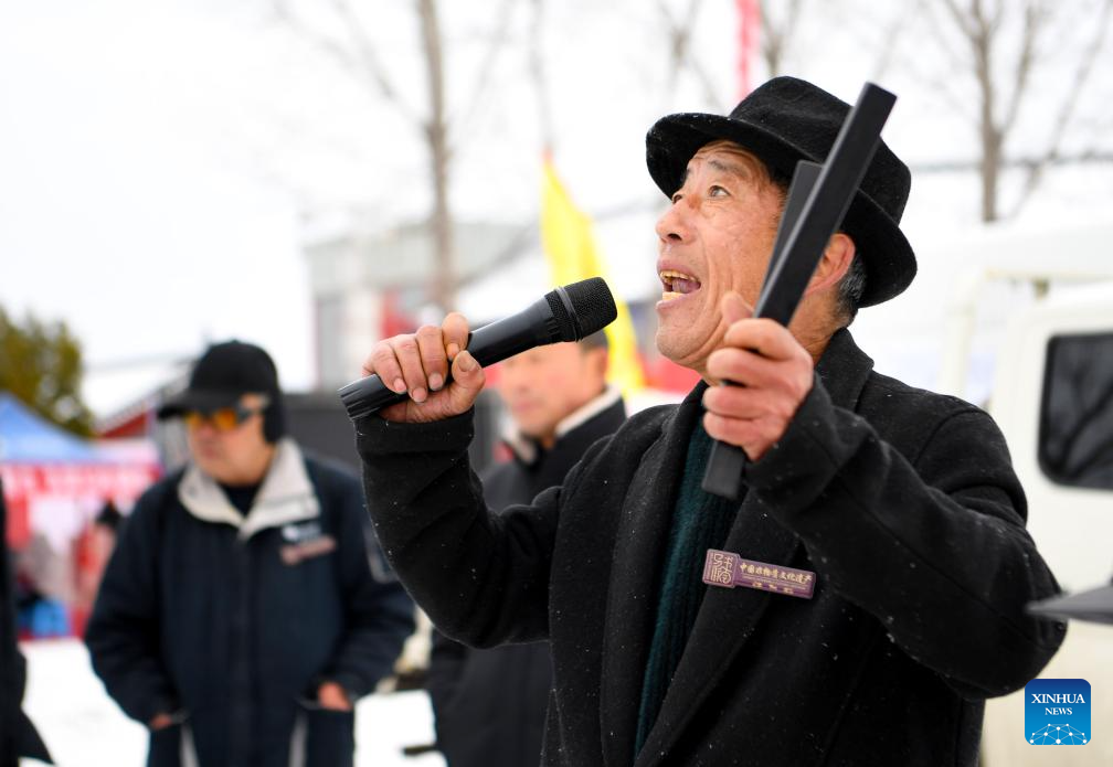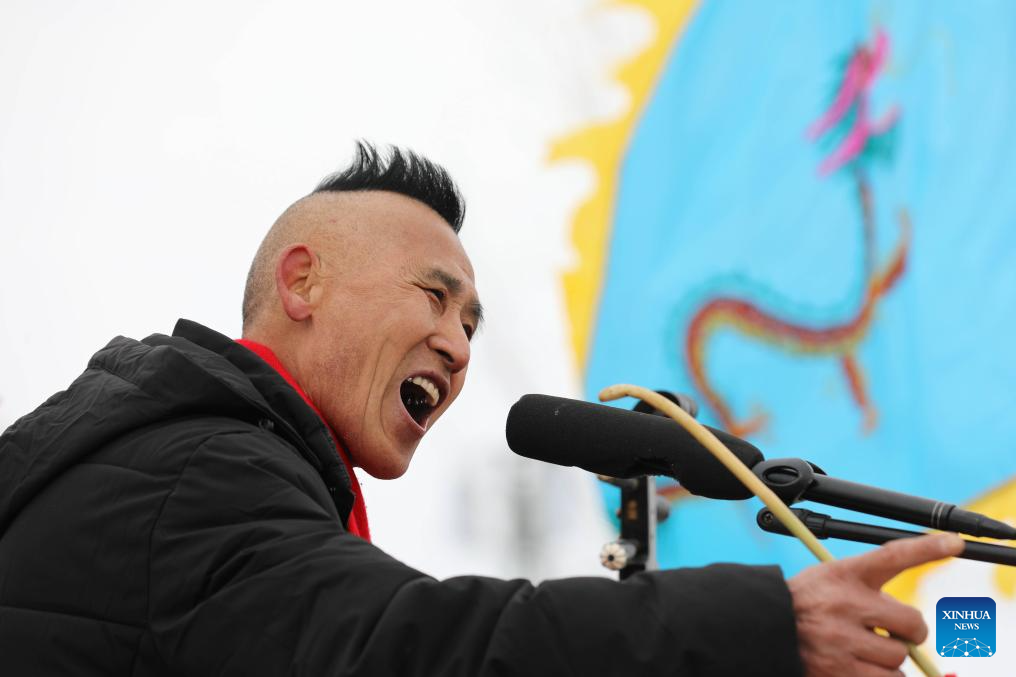 A folk artist performs during the Quyi fair in Majie Village of Baofeng County, central China's Henan Province, Feb. 22, 2024. (Xinhua/Hao Yuan)