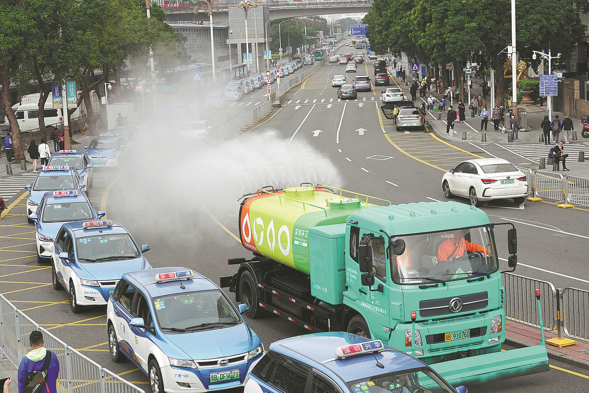 Workers spray water on roads in Shenzhen, Guangdong province, to suppress dust. CHINA DAILY