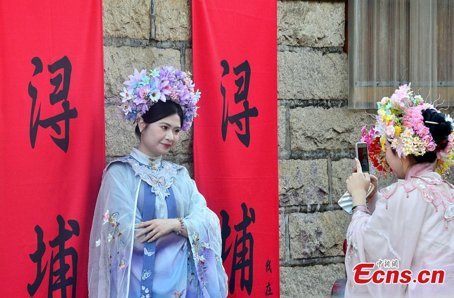 A woman wearing a flowery headwear poses for photos at Xunpu Village of Quanzhou, east China's Fujian Province, Feb. 21, 2024. (Photo: China News Service/Zhang Bin)