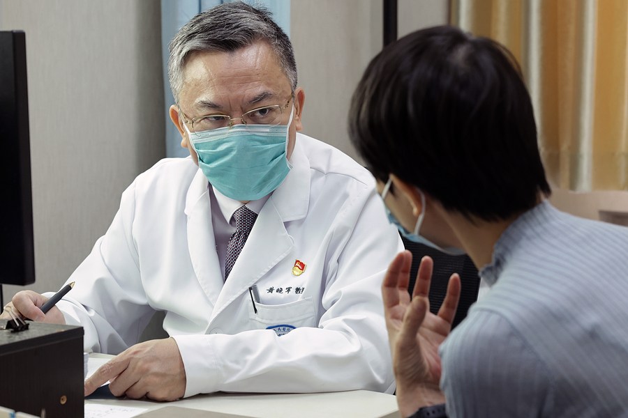 Huang Xiaojun speaks with a patient at Peking University People's Hospital in Beijing, capital of China, July 6, 2023. TO GO WITH "Chinese scientist awarded for groundbreaking work in transplantation, cellular therapy" (Xinhua/Zhang Yuwei)