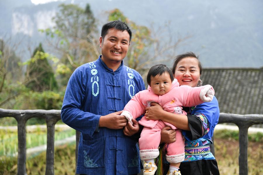 This file photo taken on Oct. 25, 2020 shows the family of Long Xianlan posing for a photo in Shibadong Village of Xiangxi Tujia and Miao Autonomous Prefecture, central China's Hunan Province. (Xinhua/Chen Sihan)
