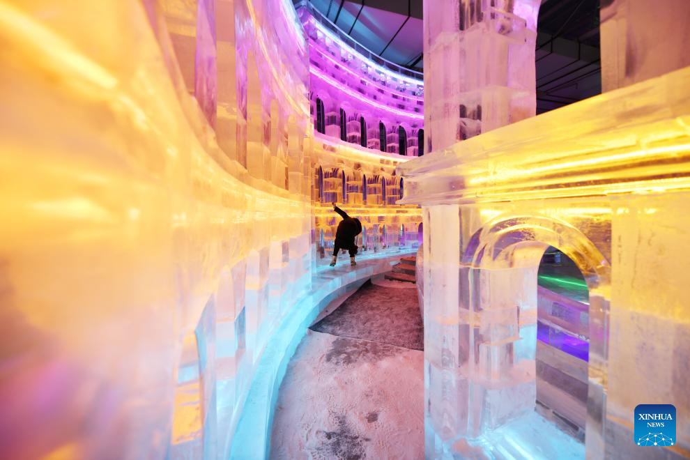 A tourist enjoys an ice slide at an ice and snow art gallery of the Sun Island scenic spot in Harbin, northeast China's Heilongjiang Province, Feb. 23, 2024. Covering an area of nearly 5,000 square meters, this indoor ice and snow art gallery wowed tourists with ice sculptures and various ice and snow entertainment. (Xinhua/Wang Jianwei)