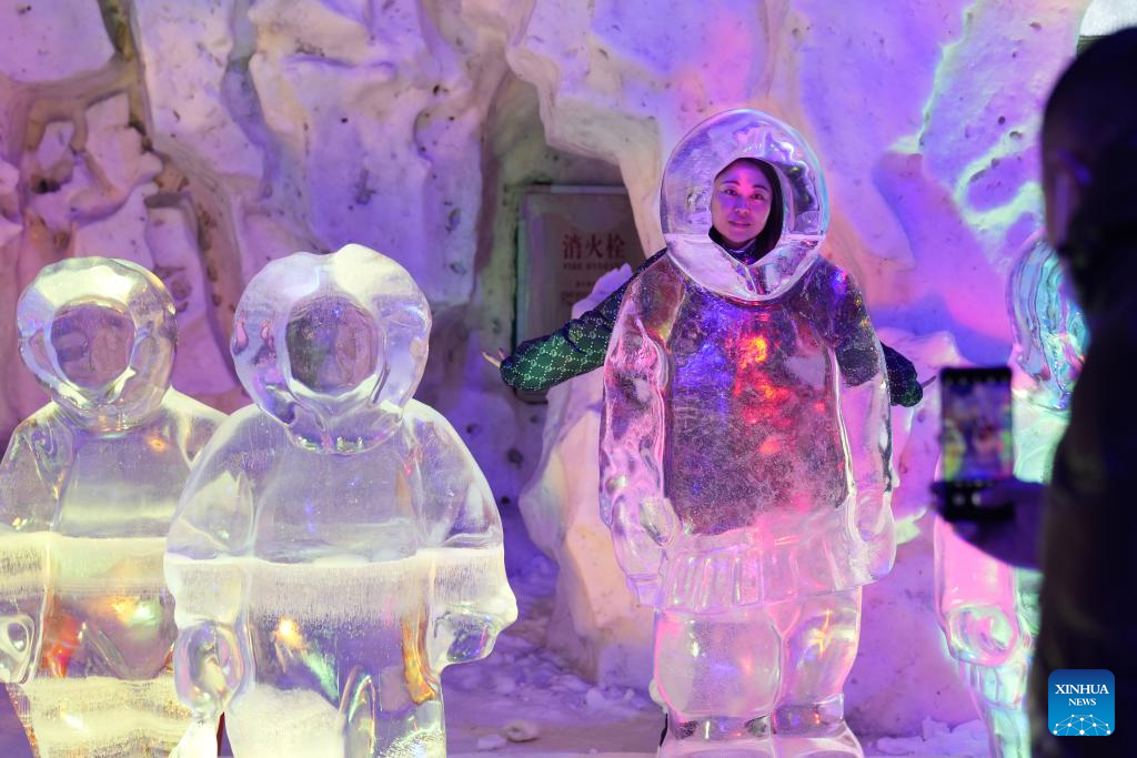 A tourist poses for photos at an ice and snow art gallery of the Sun Island scenic spot in Harbin, northeast China's Heilongjiang Province, Feb. 23, 2024. Covering an area of nearly 5,000 square meters, this indoor ice and snow art gallery wowed tourists with ice sculptures and various ice and snow entertainment. (Xinhua/Wang Jianwei)