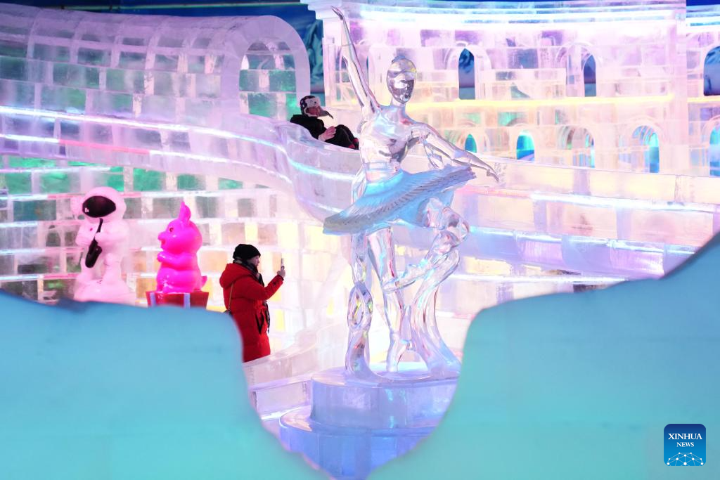 Tourists have fun at an ice and snow art gallery of the Sun Island scenic spot in Harbin, northeast China's Heilongjiang Province, Feb. 23, 2024. Covering an area of nearly 5,000 square meters, this indoor ice and snow art gallery wowed tourists with ice sculptures and various ice and snow entertainment. (Xinhua/Wang Jianwei)