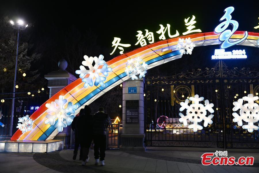 Lanterns themed on the 14th National Winter Games are illuminated in Zhalantun City, a host city of the games, north China's Inner Mongolia Autonomous Region, Feb. 25, 2024. (Photo: China News Service/Liu Huawen)
