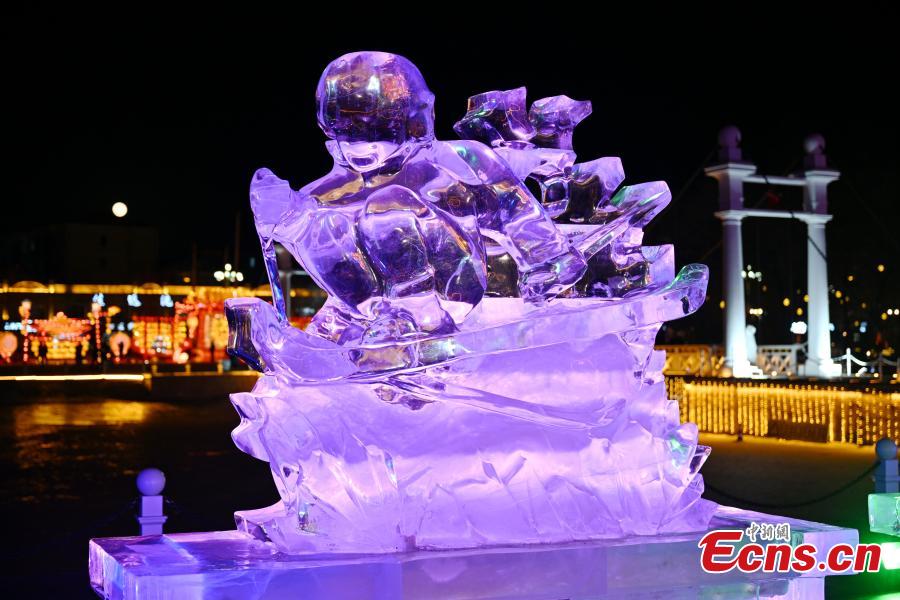 An ice sculpture themed on the 14th National Winter Games is illuminated in Zhalantun City, a host city of the games, north China's Inner Mongolia Autonomous Region, Feb. 25, 2024. (Photo: China News Service/Liu Huawen)