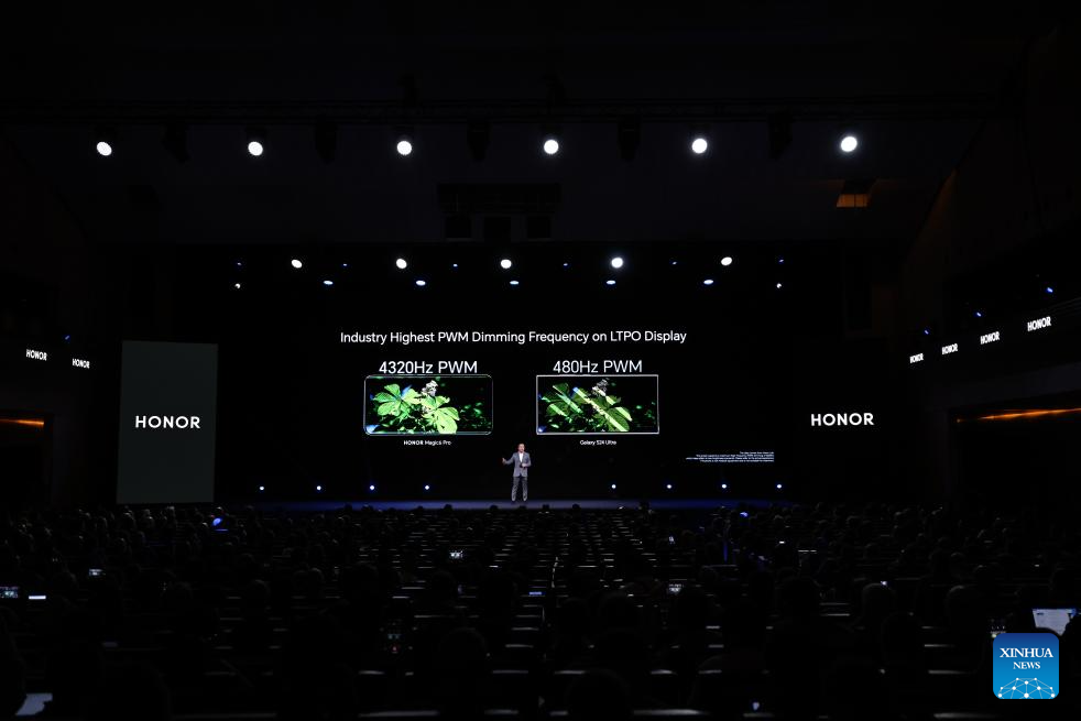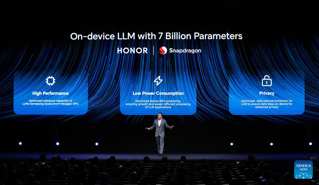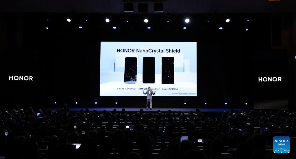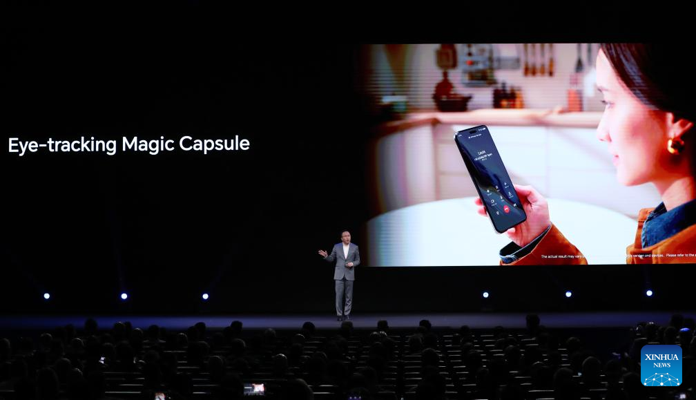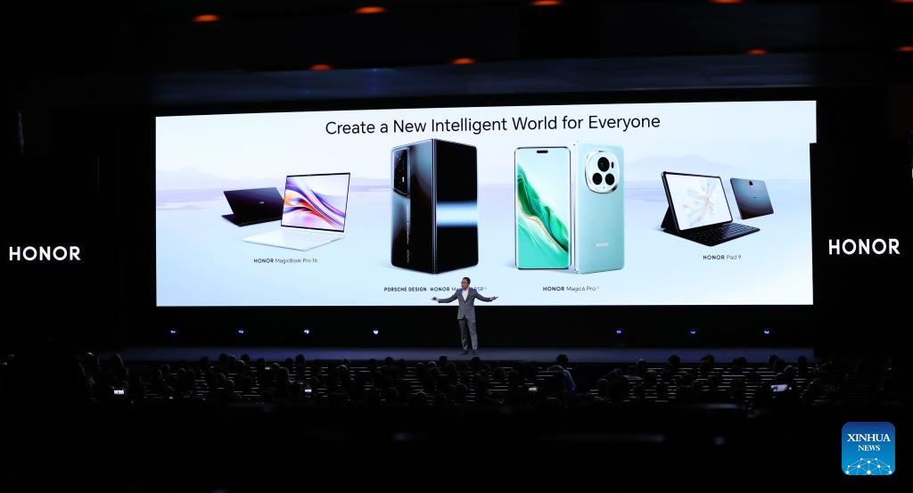George Zhao, CEO of Chinese smartphone maker HONOR, introduces new products during the HONOR global launch event in Barcelona, Spain, Feb. 25, 2024. HONOR launched here on Sunday its Magic6 Series, Magic V2 Series and MagicBook Pro 16. (Xinhua/Gao Jing)