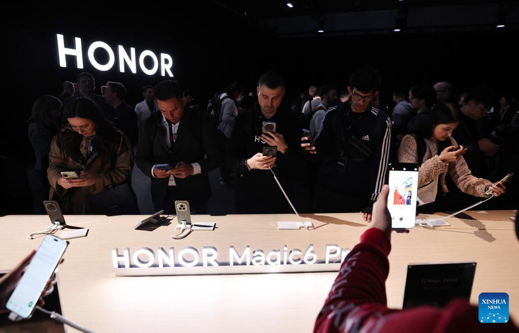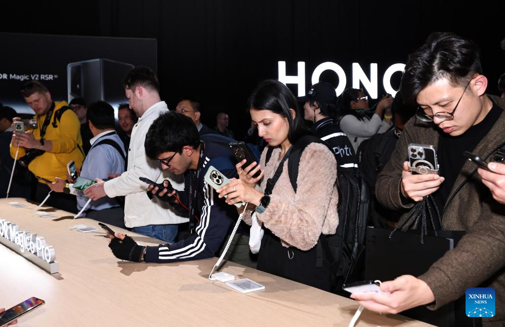 Visitors try products of Chinese smartphone maker HONOR after the HONOR global launch event in Barcelona, Spain, Feb. 25, 2024. HONOR launched here on Sunday its Magic6 Series, Magic V2 Series and MagicBook Pro 16. (Xinhua/Gao Jing)