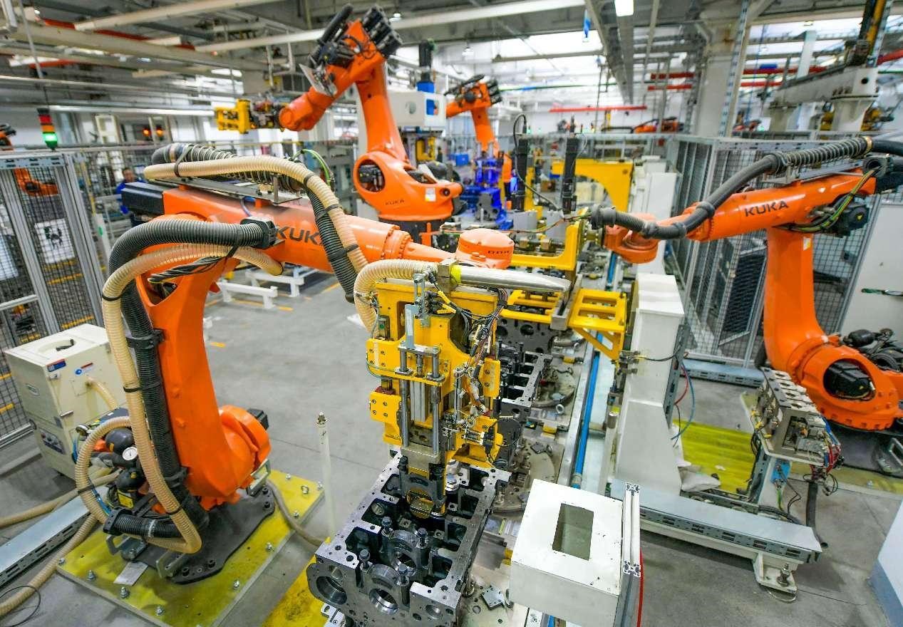 Diesel engines are assembled by robotic arms in a workshop of YTO Group Corporation in Luoyang, central China's Henan province. (People's Daily Online/Zhang Yixi)
