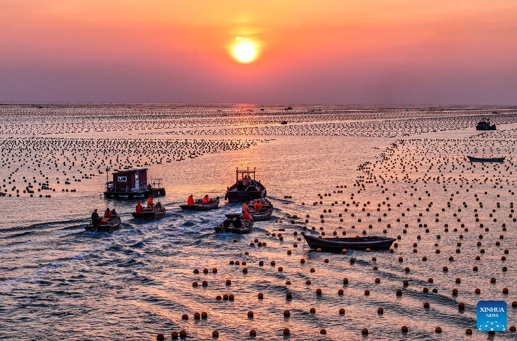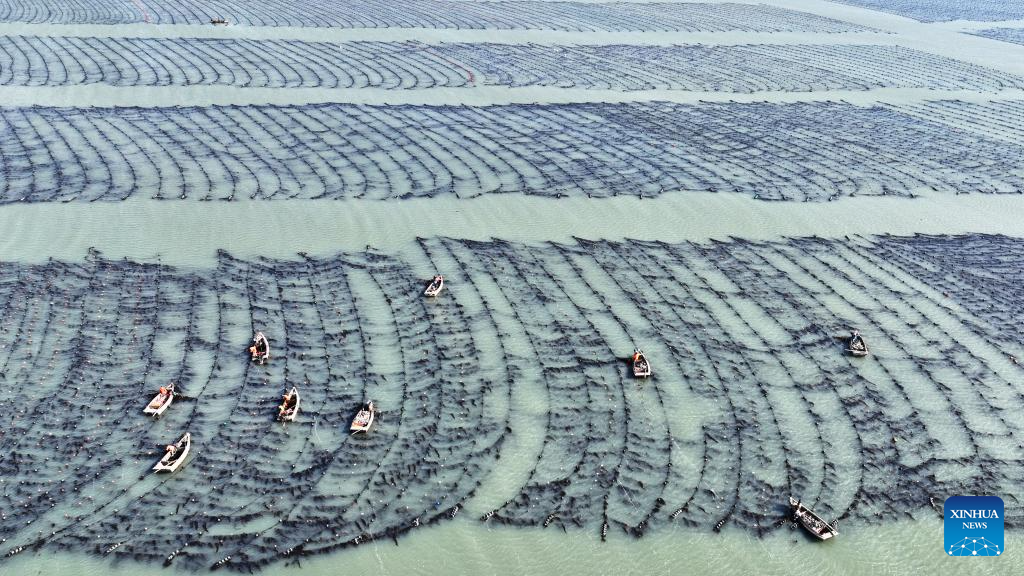 An aerial drone photo taken on Feb. 26, 2024 shows fishermen working at a marine ranch in Ailun Bay of Rongcheng City, east China's Shandong Province. (Photo by Wang Fudong/Xinhua)