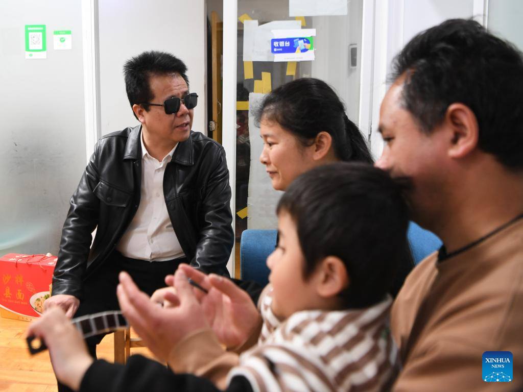 Wang Yongcheng (1st L) gives Spring Festival gifts to people with visual impairment in Fuzhou, southeast China's Fujian Province, Feb. 18, 2024.(Xinhua/Jiang Kehong)
