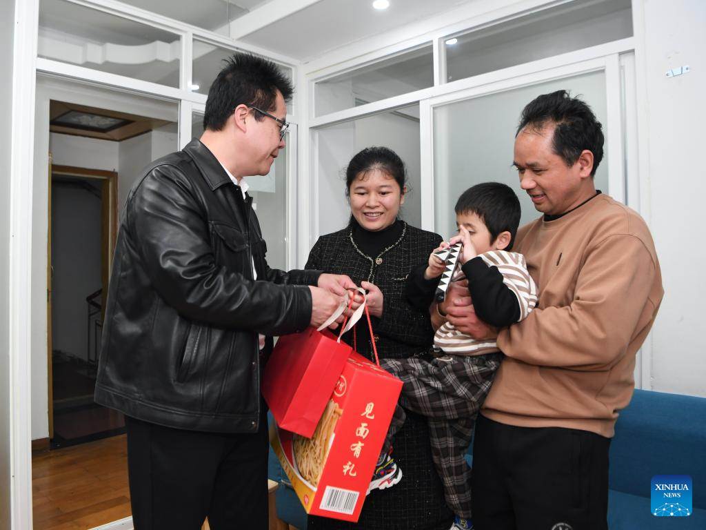 Wang Yongcheng (1st L) learns about the education of children of people with visual impairment and their daily life in an affordable housing community in Fuzhou, southeast China's Fujian Province, Feb. 18, 2024. (Xinhua/Jiang Kehong)