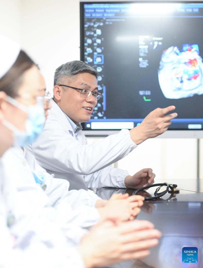 Zhang Junjie (R) communicates with colleagues at the Nanjing First Hospital in Nanjing, east China's Jiangsu Province, Feb. 20, 2024. (Xinhua/Ji Chunpeng)