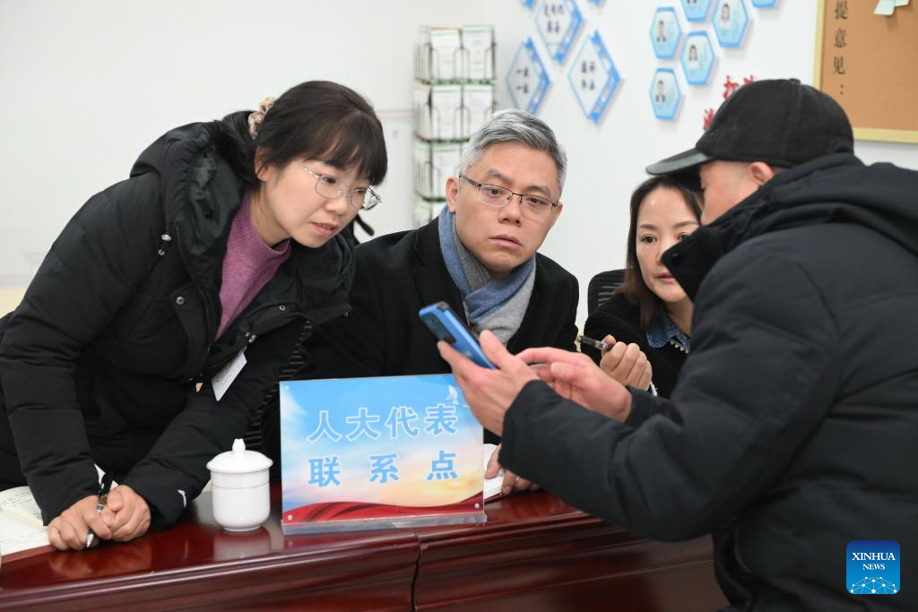 Zhang Junjie (2nd L) communicates with residents at a local legislators' liaison station in Qinhuai District of Nanjing, east China's Jiangsu Province, Feb. 22, 2024. (Xinhua/Ji Chunpeng)