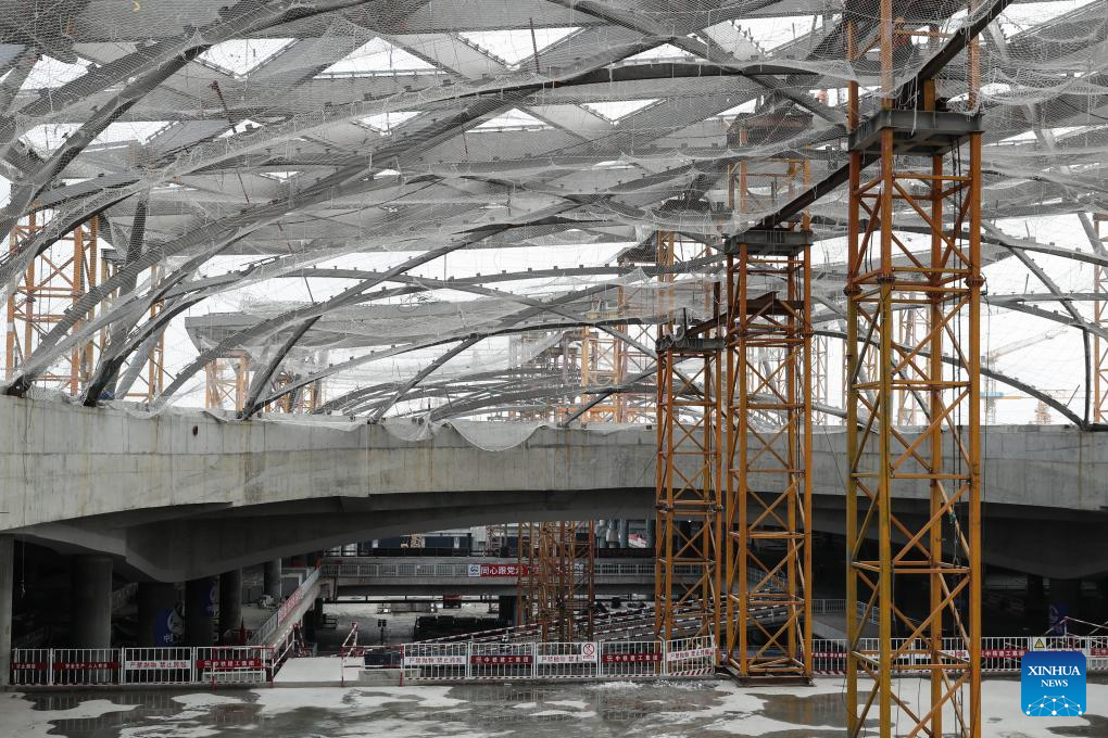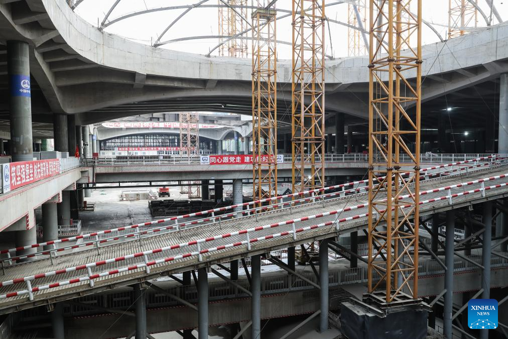This photo taken on Feb. 27, 2024 shows the construction site of the integrated transportation hub at the Beijing Sub-center Station in Tongzhou District, sub-center of Beijing, capital of China. At present, the construction of the integrated transportation hub, which is located at the core area of Beijing's sub-center Tongzhou District, is proceeding smoothly. (Xinhua/Shan Yuqi)