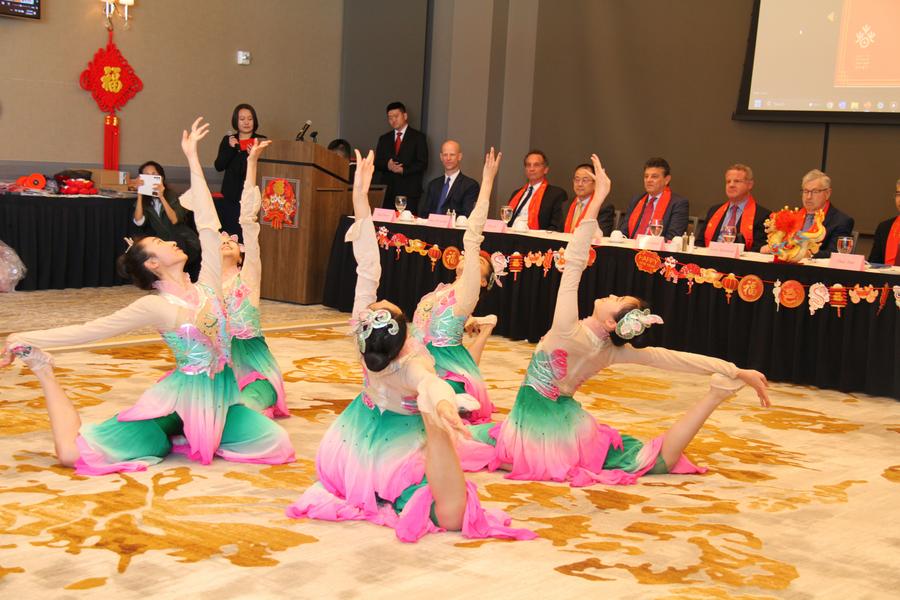 Students of the High School Affiliated to Renmin University of China stage a dance during an event to celebrate Chinese Lunar New Year in Muscatine, Iowa, the United States, Feb. 9, 2024. (Xinhua/Xu Jing)