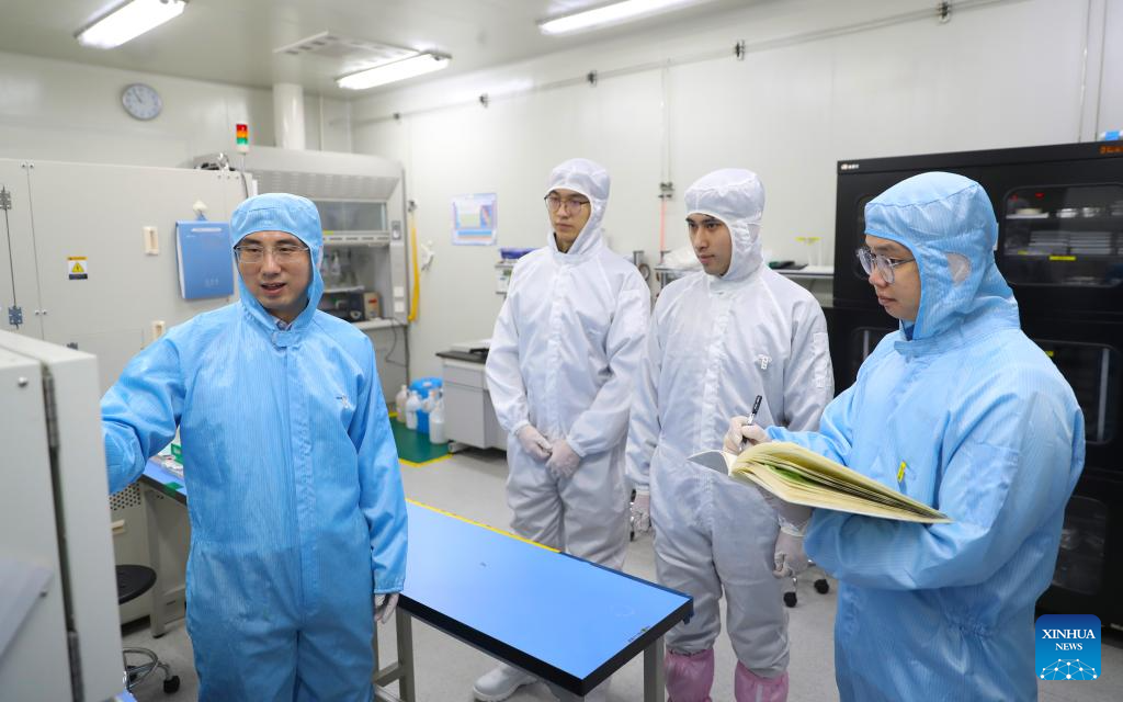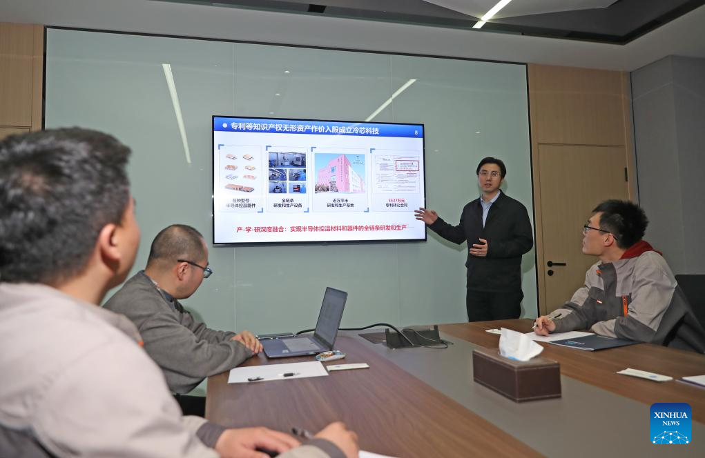 Sun Dongming (2nd R) communicates with employees of a semiconductor technology company in Shenyang, northeast China's Liaoning Province, Feb. 24, 2024.(Xinhua/Yang Qing)