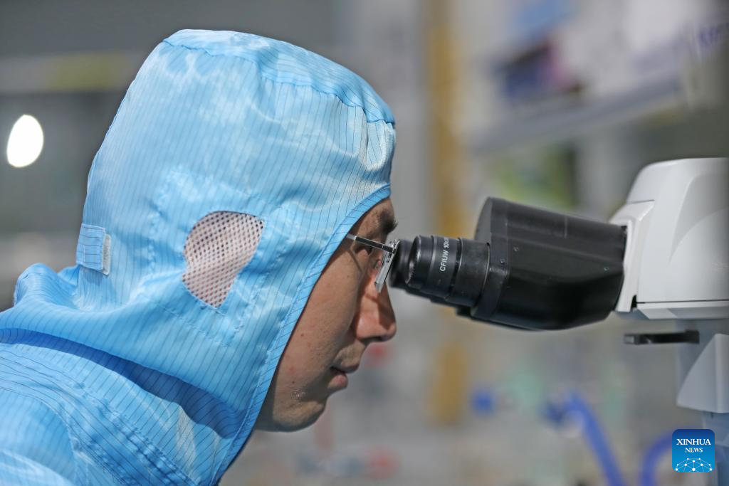 Sun Dongming observes an experimental sample at a laboratory of the Institute of Metals of the Chinese Academy of Sciences in Shenyang, northeast China's Liaoning Province, Feb. 24, 2024. (Xinhua/Yang Qing)