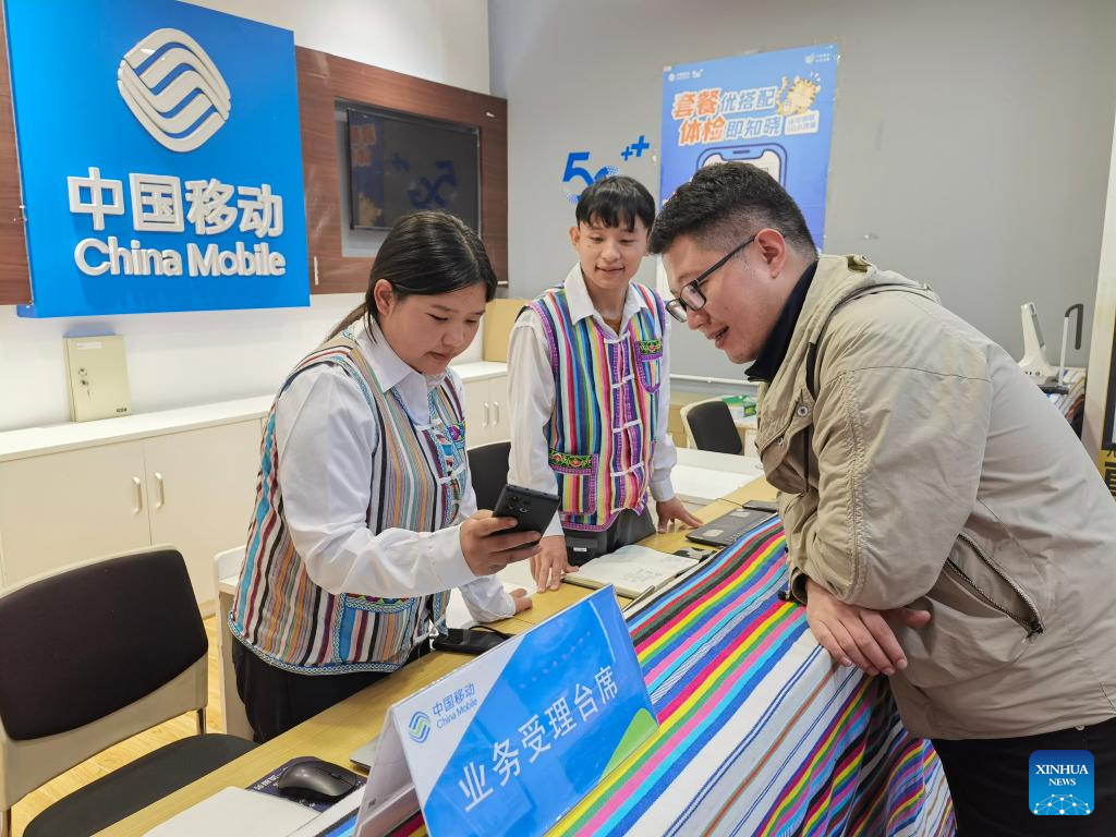 This file photo taken on Oct. 26, 2023 shows a villager (R) asking a staff member about telecom services at a branch of China Mobile in Dulongjiang Township of Drung-Nu Autonomous County of Gongshan, southwest China's Yunnan Province. (Xinhua)