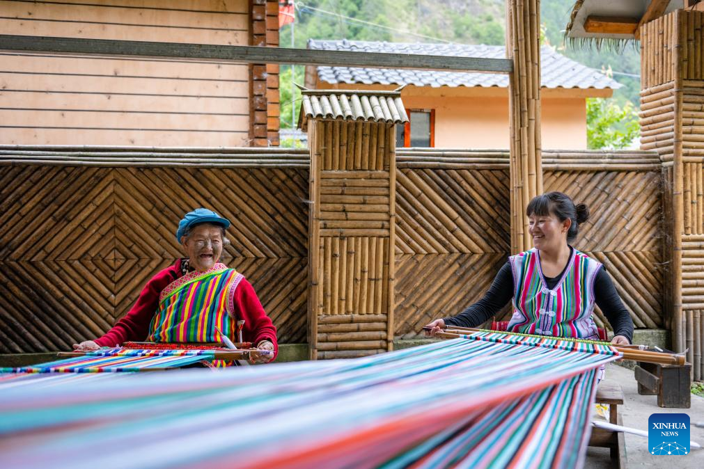 This file photo taken on May 10, 2022 shows Li Wenshi (L) and her daughter weaving blankets in Dizhengdang Village of Dulongjiang Township, Drung-Nu Autonomous County of Gongshan, southwest China's Yunnan Province. (Xinhua/Cao Mengyao)