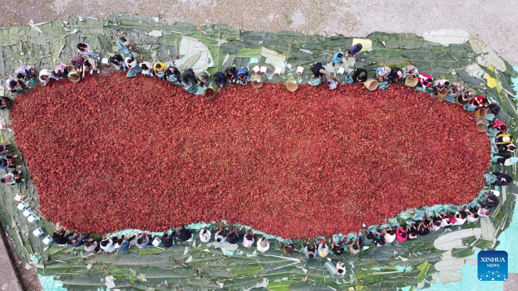 An aerial drone file photo taken on Oct. 30, 2021 shows villagers processing tsao-ko amomum fruits in Dulongjiang Township, Drung-Nu Autonomous County of Gongshan, southwest China's Yunnan Province. (Xinhua)