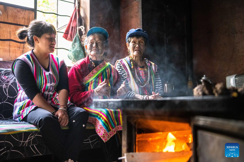 This file photo taken on May 10, 2022 shows Li Wenshi (C) chating with her family members at home in Dizhengdang Village of Dulongjiang Township, Drung-Nu Autonomous County of Gongshan, southwest China's Yunnan Province. (Xinhua/Cao Mengyao)