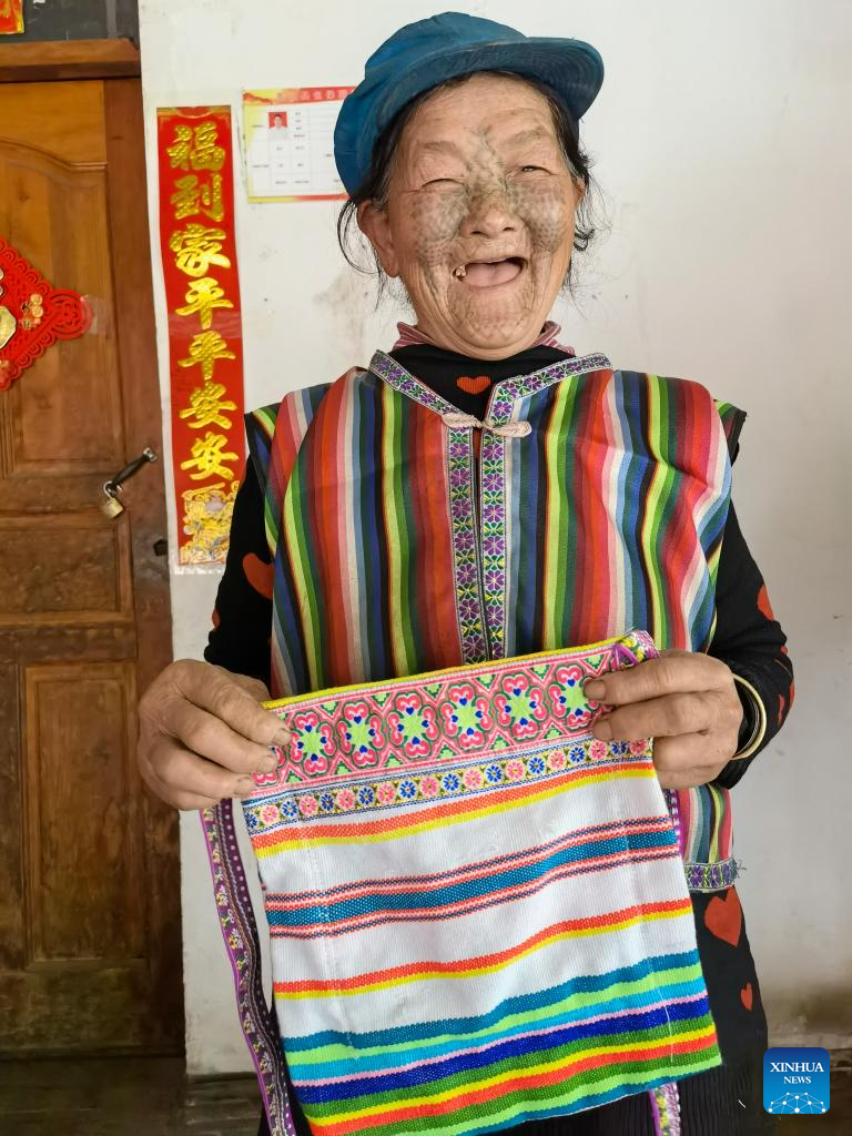 This file photo taken on April 11, 2022 shows Li Wenshi displaying a traditional blanket in Dizhengdang Village of Dulongjiang Township, Drung-Nu Autonomous County of Gongshan, southwest China's Yunnan Province. (Xinhua/Ji Zhepeng)