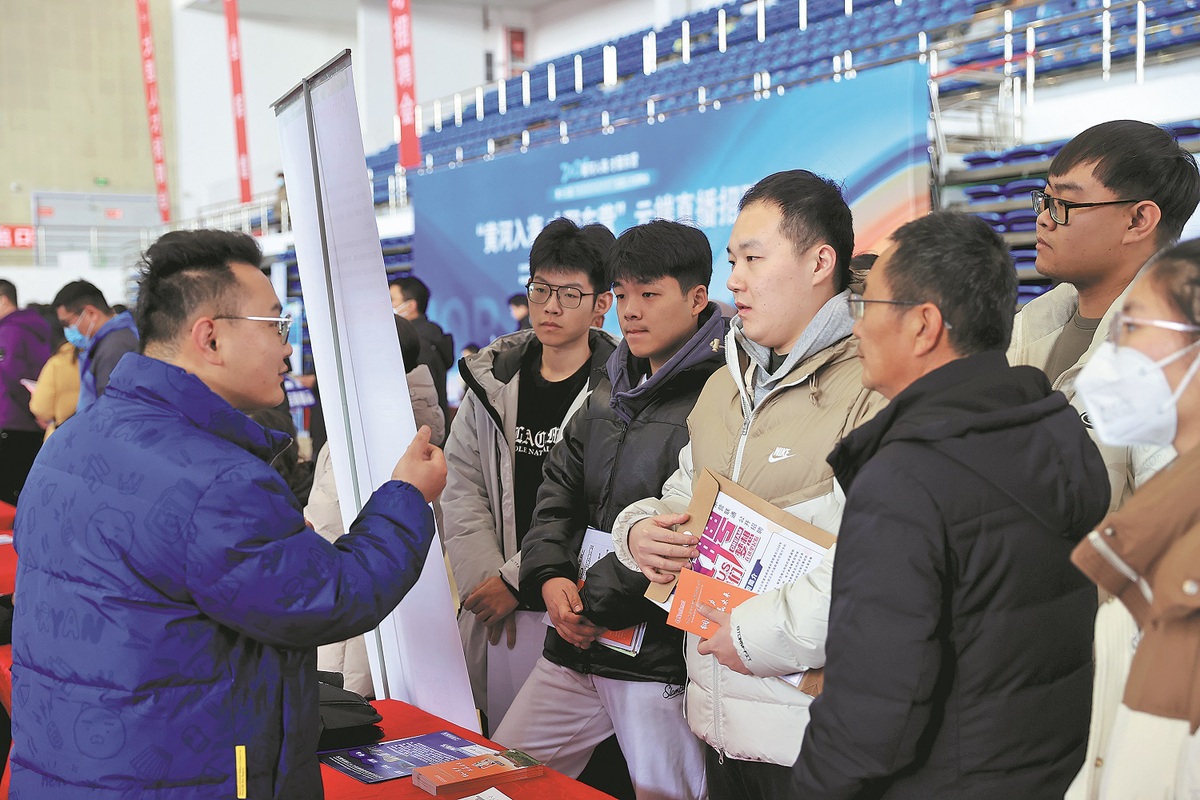 Job hunters consult an employer about posts at a job fair held in Dongying, Shandong province, on Jan 27, 2024. [Photo/China Daily]