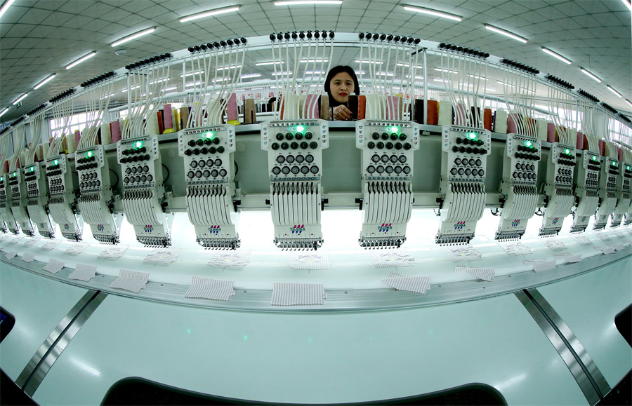 A staff member makes garment embroidery products at a knitting company in Qingdao, East China's Shandong province, Feb 18, 2024. [Photo/Xinhua]