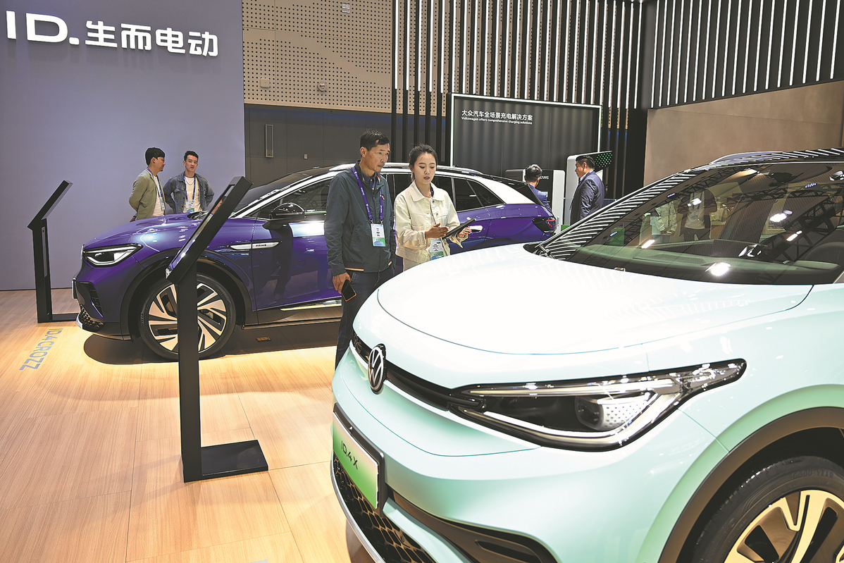 Visitors check out electric vehicles during the 2023 World New Energy Vehicle Congress in Haikou, Hainan province, in December. SHI ZHONGHUA/XINHUA