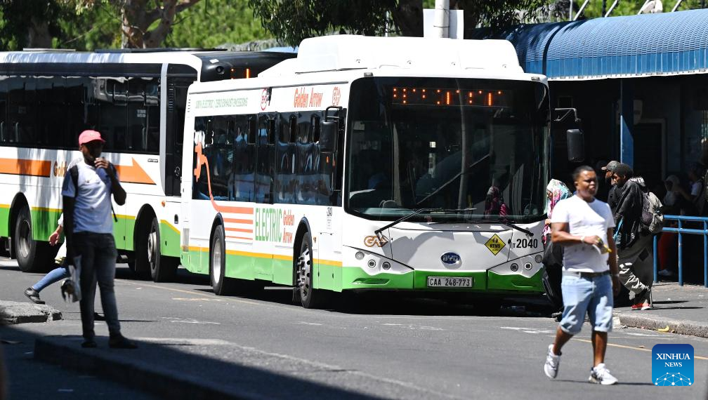 Passengers board a BYD electric bus in Cape Town, South Africa, Feb. 28, 2024. China-made electric buses have been incorporated into the day-to-day operations of Golden Arrow Bus Services here. (Photo by Xabiso Mkhabela/Xinhua)