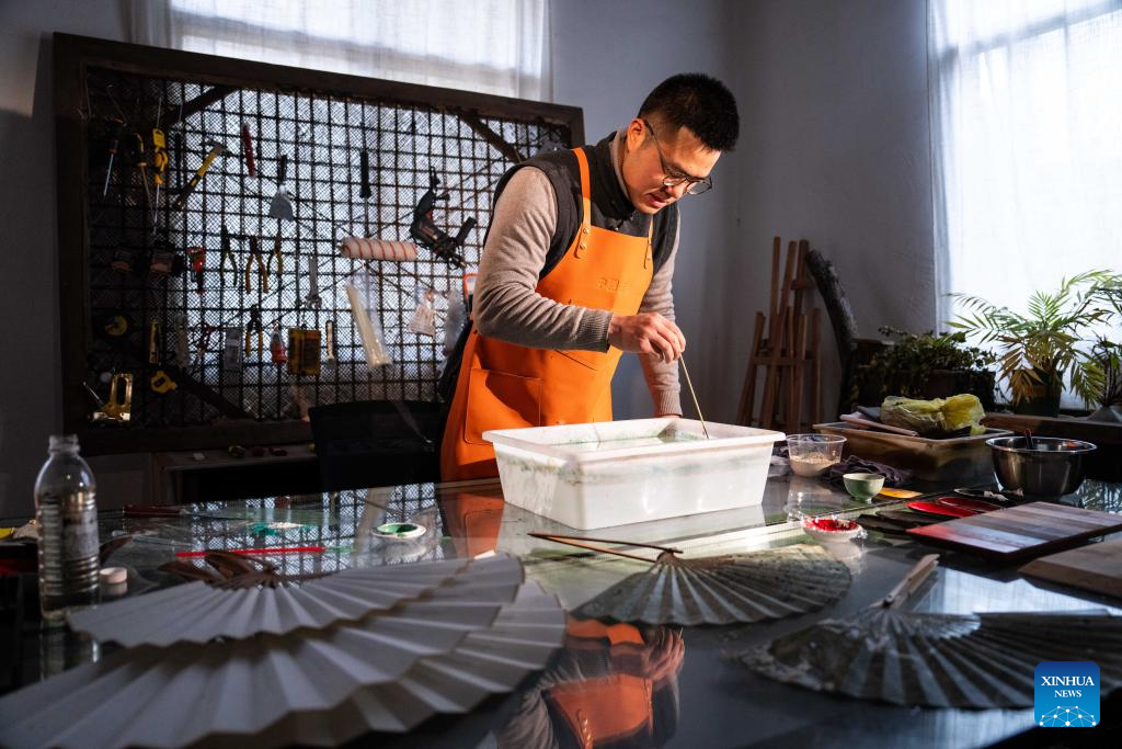 Hao Guanxiong makes lacquer coated fan at his studio in Changsha, central China's Hunan Province, Feb. 28. 2024. (Xinhua/Chen Sihan)