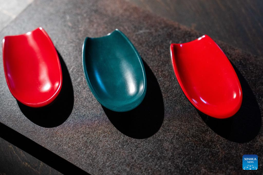 Lacquer coated artworks are displayed at Hao Guanxiong's studio in Changsha, central China's Hunan Province, Feb. 28. 2024. (Xinhua/Chen Sihan)