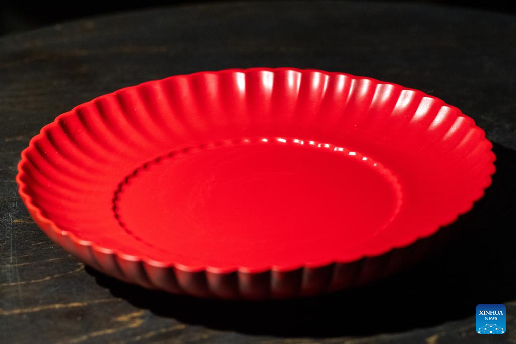A lacquer coated plate is displayed at Hao Guanxiong's studio in Changsha, central China's Hunan Province, Feb. 28. 2024. (Xinhua/Chen Sihan)