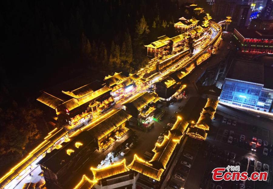 Youzhou ancient town is lit up at night, creating a dream-like scenery in Youyang Tujia and Miao Autonomous County, Chongqing, Feb. 29, 2024. (Photo: China News Service/Zhou Yi)